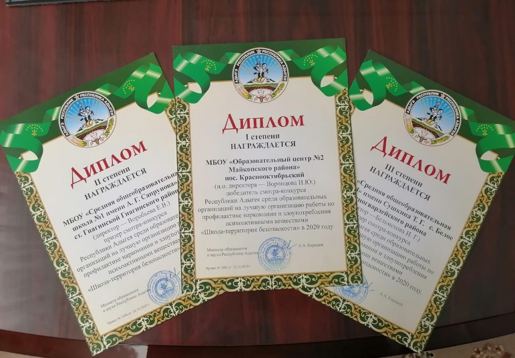 Подведены итоги смотра-конкурса Республики Адыгея среди образовательных учреждений на лучшую организацию работы по профилактике наркомании и злоупотребления психоактивными веществами «Школа-территория безопасности» в 2020 году. Конкурс проводится Министерством образования и науки Республики Адыгея в рамках реализации мероприятий государственной программы Республики Адыгея «Развитие здравоохранения» на 2014-2021 годы с целью выявления в Республике Адыгея образовательных организаций , имеющих наиболее значимый опыт в организации профилактики наркомании и формирования здорового образа жизни.