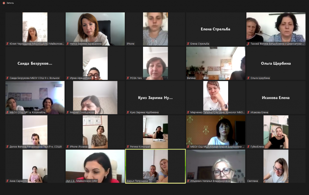 Спикером мероприятия выступила Хут Саида Ерстемовна, заместитель директора по социально-психологической работе федерального государственного бюджетного профессионального образовательного учреждения «Майкопское специальное учебно-воспитательное учреждение закрытого типа». На платформе zoom, в формате живого общения, были обсуждены проблемные вопросы, сформулированы предложения, направленные на повышение эффективности мер профилактической работы с несовершеннолетними, имеющими первичные признаки деструктивного поведения в общеобразовательной среде, были рассмотрены алгоритмы работы педагога-психолога, социального педагога в разных ситуациях, доступные и эффективные методы работы с такими детьми.